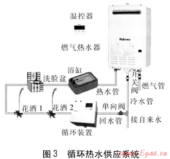 第二種方案:熱水器依然安裝于戶外陽(yáng)臺(tái),另為熱水器添置一套循環(huán)裝置(含小型水泵、水溫設(shè)定及感應(yīng)裝置、顯示屏等),組成一個(gè)家用中央循環(huán)熱水供應(yīng)系統(tǒng)(見(jiàn)圖3)。用戶在每次使用熱水之前,只要先開(kāi)啟室內(nèi)任意一個(gè)熱水出水口的水龍頭,流水約1~2s再關(guān)閉,這樣就給了循環(huán)水泵一個(gè)啟動(dòng)運(yùn)行的信號(hào),循環(huán)水泵開(kāi)始自動(dòng)循環(huán)。熱水器的水流感應(yīng)器感應(yīng)到水流就會(huì)啟動(dòng)燃燒。當(dāng)循環(huán)水泵機(jī)盒感應(yīng)器感應(yīng)到循環(huán)管路中水溫上升到預(yù)先設(shè)定的溫度,如40℃時(shí),循環(huán)水泵就會(huì)自動(dòng)停止工作。然后,要使用熱水時(shí)一開(kāi)水龍頭即時(shí)就有設(shè)定水溫的熱水出來(lái)了。相應(yīng)冷熱水循環(huán)管道需于樓宇建造期間預(yù)先暗埋敷設(shè),而熱水管最好能適當(dāng)絕熱。