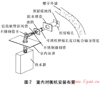 然而,對(duì)衡機(jī)有關(guān)煙管的安裝位置需于樓宇建造期間預(yù)先留好孔洞,且保證煙管長(zhǎng)度盡可能短,煙管的彎頭數(shù)量盡可能少(而強(qiáng)制排煙式熱水器的煙管最大長(zhǎng)度、彎頭最大數(shù)目等,應(yīng)遵照制造商的指引)。室內(nèi)對(duì)衡機(jī)安裝布置見(jiàn)圖2。