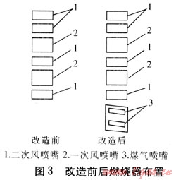 鍋爐原煤粉燃燒器為四角切圓布置,考慮到煤氣燃燒與煤粉燃燒的兼容性和爐內(nèi)空氣動(dòng)力場(chǎng)的穩(wěn)定性,煤氣燃燒器仍以切圓布置方式為宜。經(jīng)計(jì)算,若煤氣燃燒器采用布置在原煤粉燃燒器下的四角切圓燃燒,則要求原煤粉燃燒器下層噴嘴至運(yùn)行層的間距應(yīng)不小于1000mm,而實(shí)際間距僅有700mm,四角切圓方案難以實(shí)現(xiàn)。因此,煤氣燃燒系統(tǒng)最終采用六角切圓布置方式,其中4只煤氣噴嘴直接布置在煤粉噴嘴下部,另外2只煤氣噴嘴布置在左右側(cè)墻的中心,主煤氣輸送管道進(jìn)入鍋爐房后分為兩根煤氣分管道布置于鍋爐兩側(cè),每根分管道再各分出3根支管連接煤氣燃燒器,見圖2。為擴(kuò)大切圓直徑,增加受熱面的吸熱量,降低火焰中心位置,煤氣燃燒器出口軸線分別在原煤粉燃燒器噴嘴出口軸線方向上水平向外偏轉(zhuǎn)20°,向下偏轉(zhuǎn)20°。改造前后燃燒器布置見圖3。綜合考慮低熱值煤氣著火與燃燒的穩(wěn)定性及火焰的長(zhǎng)度,煤氣燃燒器采用雙通道煤氣噴嘴,具有部分預(yù)混作用,噴嘴出口煤氣流速約32m/s,空氣流速約35m/s[4~7]。