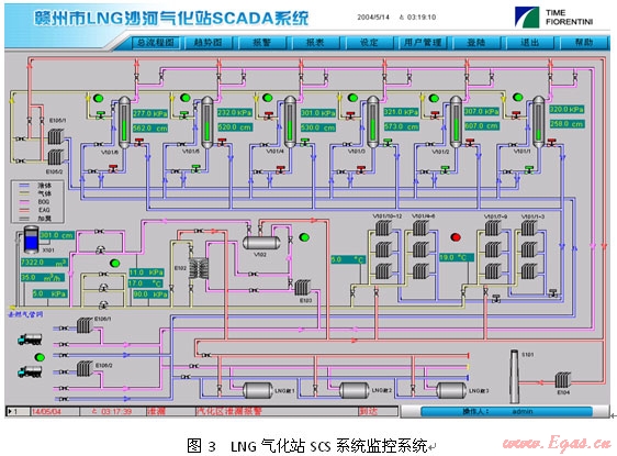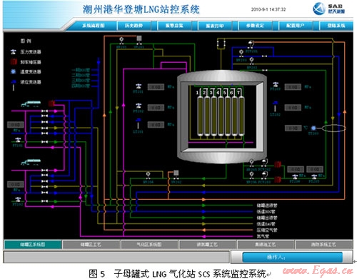 SAE-LSMS系統(tǒng)已成功在國內(nèi)應用多年,2005年深圳美視電廠總管式增壓40kfg,氣化量48,000NM3/H,2007年深圳燃氣集團梅林LNG應急調(diào)峰站單元式增壓20kfg,氣化量小時40,000NM3/H,2008年南京港華兩個2500立方LNG子母罐氣化站均已應用該系統(tǒng)。均取得了較好的效果。圖5為廣東潮州子母罐式LNG氣化站SCS系統(tǒng)監(jiān)控畫面。