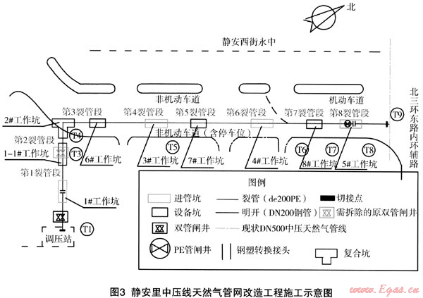 下面,以靜安里中壓線天然氣管網(wǎng)改造工程為實例,具體介紹一下裂管施工技術(shù)在燃氣管線改造丁程中的應(yīng)用。