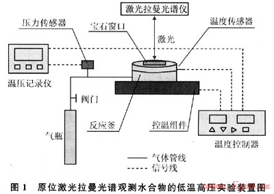原位激光拉曼光譜觀測水合物的低溫高壓實(shí)驗(yàn)裝置系青島海洋地質(zhì)研究所水合物實(shí)驗(yàn)室自主設(shè)計(jì)、研發(fā),圖1為裝置的示意圖。整套裝置主要包括供氣系統(tǒng)、反應(yīng)釜、溫度控制系統(tǒng)、數(shù)據(jù)記錄儀、激光拉曼光譜儀等5個(gè)主要組成部分。裝置采用Pt1OOc精密溫度傳感器和半導(dǎo)體控溫,可控范圍-10~30℃,并能夠?qū)崿F(xiàn)梯度控溫。