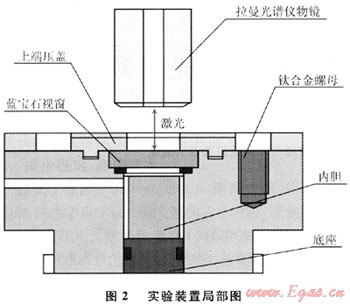 圖2為拉曼光譜原位觀測裝置的局部圖,拉曼光譜儀的激光透過藍(lán)寶石窗口聚焦在水合物表面,可得到水合物的拉曼光譜圖。反應(yīng)釜分為上下兩個(gè)部分,兩部分的結(jié)合部借鑒了相機(jī)和鏡頭的卡口結(jié)構(gòu),便于開閉。釜體上部的壓蓋采用螺釘壓緊,螺釘、上端壓蓋、藍(lán)寶石視窗以及容器寶石密封端就成為一個(gè)整體。這一部分通過與一個(gè)帶有“O”形圈密封的容器底座結(jié)合,形成一個(gè)密封的壓力容器腔。腔體內(nèi)部設(shè)有內(nèi)膽,容積約1.1mL,用于裝填反應(yīng)介質(zhì)。