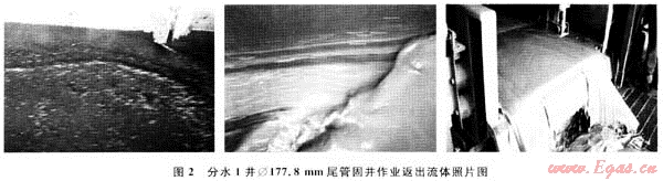 該技術(shù)已在川渝地區(qū)“三高”氣田多口超深井尾管固井作業(yè)中得到了成功應(yīng)用,以分水1井為例(2008年中石油陸上第一口超深井,井深為7353.84m),該井Ø177.8mm尾管固井采用前后隔離液防污染技術(shù),先注20m3前隔離液,中心管附近注6m3后隔離液,有效隔離了鉆井液和水泥漿,防止頂替過(guò)程和拔中心管后水泥漿和鉆井液直接接觸引發(fā)井下復(fù)雜。施工時(shí)間為4.5h,泵注水泥漿和頂替過(guò)程以及拔中心管后大排量循環(huán)鉆井液期間,泵壓平穩(wěn)。碰壓為19MPa,碰壓后起鉆5柱未遇阻,鉆具懸重與稱(chēng)重時(shí)基本一致,后以1.8m3/min大排量正循環(huán),鉆井液、隔離液以及水泥漿返出界面清晰,相互之間無(wú)較嚴(yán)重污染現(xiàn)象,3種流體及摻混段流動(dòng)性均很好,充分說(shuō)明隔離液與水泥漿化學(xué)兼容性良好。井口返出流體照片從左至右分別是鉆井液、隔離液和水泥漿(見(jiàn)圖2)。