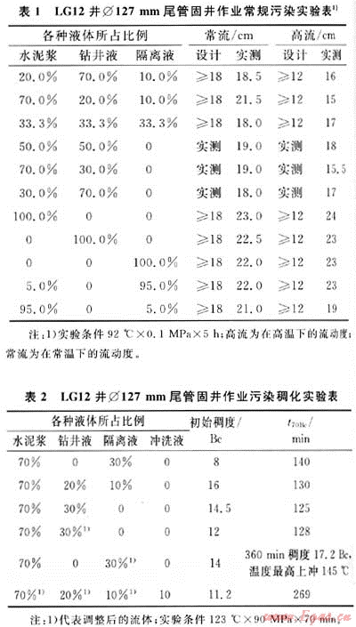 3) 必須開(kāi)展隔離液與水泥漿的污染稠化實(shí)驗(yàn),保證隔離液對(duì)水泥漿的稠化時(shí)間無(wú)不良影響,避免固井工程事故的發(fā)生。