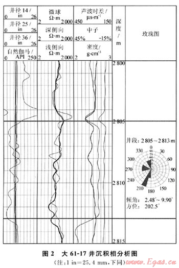 地層傾角測井是一種能直觀反映單井剖面地質(zhì)構(gòu)造的測井方法,通過相關(guān)對比等方法處理得到的傾角矢量圖(圖1),可以了解目的油氣藏砂體的地層產(chǎn)狀特征、砂體展布及古水流和物源方向、判斷地應(yīng)力方向、識別裂縫等[1~7]。
