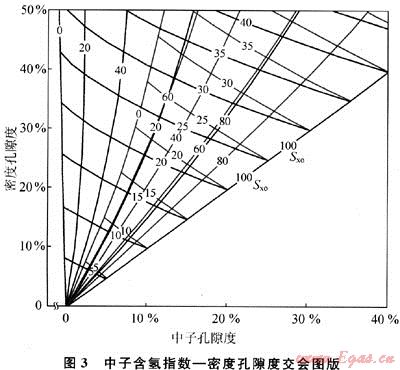 根據(jù)中子測(cè)井含氫指數(shù)和經(jīng)骨架密度校正的密度孔隙度,進(jìn)入中子含氫指數(shù)密度孔隙度交會(huì)圖版(圖3),再根據(jù)儲(chǔ)層深度選擇相應(yīng)的關(guān)系曲線族,則由交會(huì)點(diǎn)位置可得到地層孔隙度(φ)。由中子測(cè)井含氫指數(shù)及計(jì)算出的密度孔隙度,在此交會(huì)圖可查出其對(duì)應(yīng)的地層孔隙度及沖刷帶含水飽和度(Sxo)。