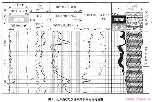 以往對(duì)儲(chǔ)層進(jìn)行氣水或油氣判別時(shí),主要基于天然氣的低含氫指數(shù)及挖掘效應(yīng),氣層視中子孔隙度降低,而聲波和密度視孔隙度增高,且其差別越大,越符合氣層特征。但在測(cè)井解釋中卻發(fā)現(xiàn)有些高產(chǎn)氣層的視中子孔隙度并不很低,而密度、聲波視孔隙度卻增大不多,故經(jīng)常導(dǎo)致氣水或油氣判別失誤[1~2]。如圖1和圖2所示,它們分別是蘇里格氣田某井產(chǎn)氣3.89×104m3/d氣層和土庫(kù)曼斯坦氣田某井產(chǎn)氣21.0×104m3/d氣層的測(cè)井響應(yīng)特征,顯然高產(chǎn)氣層的視孔隙度關(guān)系反而更接近水層特征。