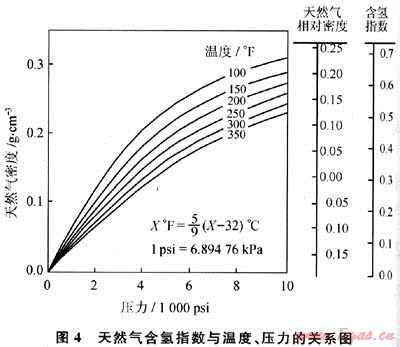 根據(jù)天然氣中子含氫指數(shù)與密度、壓力、溫度的關(guān)系(圖4),在已知中子含氫指數(shù)和溫度或已知密度和溫度的情況下,便可查出地層壓力。