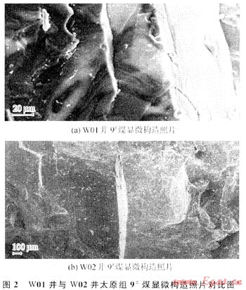 通過WO1井和W02井煤樣品的顯微構(gòu)造照片對比,可清楚地觀察到兩口鉆孔巖心顯微構(gòu)造的明顯差異。WO1井所處的構(gòu)造位置是應力場低值分布區(qū),煤巖割理裂隙十分發(fā)育。圖2-a顯示出在大約100μm長度范圍內(nèi)分布有條微裂隙,裂縫明顯地具有張剪性力學特性;而W02井由于處應力場高值分布區(qū),煤巖裂縫分布密度低且為閉合(圖2-b)。