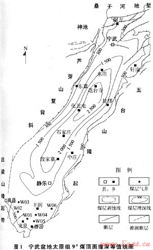 綜合以上研究,構(gòu)造部位、地應力、封蓋層共同控制煤層氣的富集與保存,是寧武盆地南部煤層氣富集的主控因素,W02井以東、W04井以南地區(qū)太原組9#煤埋深小于1500m,處于應力場低值區(qū),煤層滲透性好、煤層頂?shù)装宸馍w條件好,同時處于構(gòu)造上斜坡帶,利于煤層氣井高產(chǎn),是煤層氣富集高產(chǎn)有利地區(qū)。