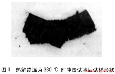可以看出,隨著熱解終溫的升高,試樣的沖擊韌度逐漸減小。熱解終溫為330℃與340℃時試樣破碎時的沖擊韌度沒有太明顯的變化,在熱解終溫為350℃時沖擊韌度明顯減小,熱解終溫為360℃時沖擊韌度減小得更多。熱解終溫為330℃時沖擊試驗后的試樣形狀見圖4,熱解終溫為340℃時沖擊試驗后的試樣形狀見圖5,熱解終溫為350℃時沖擊試驗后的試樣形狀見圖6。