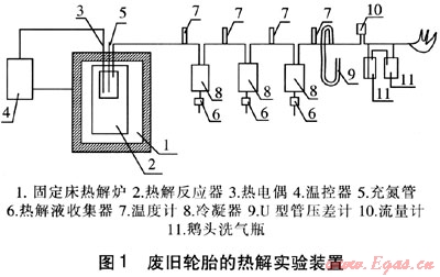 廢舊輪胎的熱解實驗裝置見圖1。實驗裝置由固定床熱解爐、熱解反應(yīng)器、熱電偶、溫控器、充氮管、熱解液收集器、溫度計、冷凝器、U型管壓差計、流量表、鵝頭洗氣瓶組成。