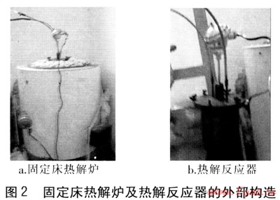 固定床熱解爐及熱解反應(yīng)器的外部構(gòu)造見圖2。熱解反應(yīng)器上部與固定床熱解爐上部平齊放置。實驗時設(shè)定固定床熱解爐的溫度,使其按固定的溫升速率(20℃/min)升溫,依靠輻射傳熱使熱解反應(yīng)器內(nèi)物料受熱并發(fā)生分解。