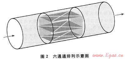 1) 與三、四聲道流量計相比,以特別方式排列的六聲道超聲波流量計有以下的決定性優(yōu)點:①抗干擾性。根據(jù)高斯-切比雪夫(Gauss-Chebyshev)理論排列聲道,并且聲道相互交叉,使流量計很大程度上不受氣體流型的影響。因此,可以不需要整流器甚至在氣體流動受到渦流、不對稱等干擾的情況下也可以實現(xiàn)高精度的測量。②冗余性。如果其中任何一個或兩個聲道失效,六聲道流量計將不會失去計量能力,失效的聲道可以通過重新復(fù)值來得到恢復(fù)。