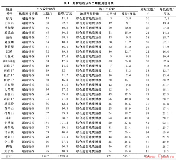 在保證工程安全的情況下,對(duì)比初步設(shè)計(jì)和施工圖設(shè)計(jì),西氣東輸二線隧道工程初步設(shè)計(jì)階段采用單一的超前鉆探進(jìn)行地質(zhì)預(yù)報(bào),初步設(shè)計(jì)階段實(shí)施超前地質(zhì)預(yù)報(bào)措施的工期及投資見表1;西氣東輸二線隧道工程施工圖設(shè)計(jì)階段采用綜合超前地質(zhì)預(yù)報(bào),施工圖設(shè)計(jì)階段實(shí)施綜合超前地質(zhì)預(yù)報(bào)措施的工期及投資見表1[9~12]。