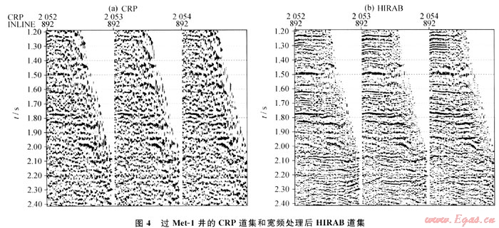 對保幅去噪的CRA道集進(jìn)行寬頻處理,得到保幅寬頻高分辨率處理的HIRAB道集。圖4為過Met-1井(中間道集)的CRP道集和寬頻處理后的HIRAB道集。可以看出:HIRAB道集的分辨率大大提高,并且其信噪比亦明顯增強(qiáng);兩種道集的波組關(guān)系與CRP道集一致。表明HIRAB具有很好的保幅性能。