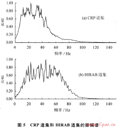 圖5-a為CRP道集目的層段(1500~2200ms)的振幅譜,頻帶為6~48Hz,頻帶寬度為42Hz,主頻為27Hz(振幅譜中的強(qiáng)低頻能量是由遠(yuǎn)炮檢距地震道的強(qiáng)低頻能量引起);圖5-b為HIRAB道集同層位的振幅譜,頻帶為12~76Hz,頻帶寬度為64Hz,主頻為44Hz??梢钥闯觯航?jīng)過處理后的HIRAB道集的高頻拓展28Hz,頻帶展寬22Hz,主頻提高了17Hz。