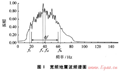在地震信號有效頻帶內(nèi),設(shè)頻寬為df、主頻為fd、視主頻(地震剖面上能夠看到的主頻)為fv、振幅衰減為0.4的最低有效頻率(有效頻帶低頻)為fl、振幅衰減為0.4的最高有效頻率(有效頻帶高頻)為fh。則有效頻帶的頻寬為: