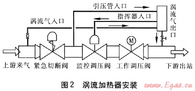 武漢西計(jì)量站來自西氣東輸淮武管道的天然氣壓力為5.0MPa,而下游供氣壓力約為1.4MPa。因此,在調(diào)壓分輸時(shí),存在較大的節(jié)流。調(diào)壓橇采用“緊急切斷閥+監(jiān)控調(diào)壓閥+工作調(diào)壓閥”的調(diào)壓模式。監(jiān)控調(diào)壓閥的指揮執(zhí)行機(jī)構(gòu)主要由預(yù)調(diào)器和指揮器組成,預(yù)調(diào)器和指揮器中均存在節(jié)流。調(diào)壓橇工作時(shí),由于指揮器的出口氣體溫度較低,且天然氣本身含有水或水合物,低溫時(shí)水容易冷凝成冰,堵塞指揮器閥口,造成調(diào)壓橇工作失效。原來主要采取電加熱的方法防止冰堵,現(xiàn)采用雙通道渦流加熱器取代電加熱器。該雙通道渦流加熱器設(shè)計(jì)的工作壓力為6.9MPa,試驗(yàn)壓力為10.3MPa,加熱功率隨上下游壓比的變化而變化。雙通道渦流加熱器可以同時(shí)加熱2路天然氣,即1臺(tái)加熱器可以同時(shí)為2臺(tái)調(diào)壓閥指揮器加熱。渦流加熱器安裝見圖2。渦流加熱器的渦流氣出口溫度較低,因此渦流氣出口與下游管道之間的連接應(yīng)盡量短,出口管徑盡量大,彎頭盡量少(最好為直管段),以防止出口管道發(fā)生冰堵。在出口處需安裝一個(gè)節(jié)流閥來控制渦流氣流量,以控制加熱溫度。在渦流加熱器渦流氣進(jìn)口處安裝一個(gè)直徑為12.7mm的小球閥,便于控制渦流加熱器的工作。從上游引壓管引入的高壓天然氣經(jīng)過渦流加熱器加熱后,進(jìn)入調(diào)壓閥指揮器。在指揮器節(jié)流降溫后,天然氣的溫度仍然高于工作狀態(tài)下天然氣的水露點(diǎn),有效地防止了冰堵。渦流加熱器安裝簡單,所有連接處均可采用卡套接頭連接[5]。