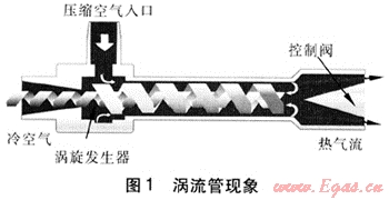 渦流管又稱Ranque Hilsch管,是一個(gè)沒有運(yùn)動(dòng)部件、結(jié)構(gòu)非常簡單的能量分離裝置[1]。氣體在降壓過程中,經(jīng)過特殊設(shè)計(jì)的渦流管時(shí),可以分為冷熱兩股氣流,這種現(xiàn)象稱為渦流管現(xiàn)象,見圖1。