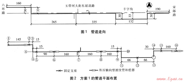 玉帶河大街東延道路位于六環(huán)路以東、宋郎路以西,DN 1400mm供熱管道沿玉帶河大街東延道路敷設(shè)。為躲避跨越六環(huán)路的橋梁,供熱管道穿越六環(huán)路的路由為玉帶河大街東延道路永中以北30m,長(zhǎng)約160m。供熱管道穿越六環(huán)路后向南折至道路永中以南3m并向東敷設(shè)。由于玉帶河大街東延道路在豐字溝設(shè)有橋梁,管道向南繞行穿越豐字溝,穿越長(zhǎng)度約132m,豐字溝以東路由仍為道路永中以南3m。該段管道在東六環(huán)西側(cè)路與豐字溝中間位置設(shè)置分支管線,管道走向見(jiàn)圖1,圖中數(shù)值單位為m。比較兩種設(shè)計(jì)方案,方案1、2的管道平面布置見(jiàn)圖2、3,圖中數(shù)值單位為m。