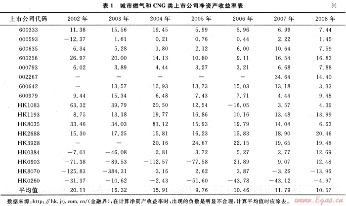 β系數(shù)的確定可從兩方面入手:第一種方法是通過建設(shè)部標(biāo)準(zhǔn)定額研究所發(fā)布的行業(yè)風(fēng)險系數(shù)表中查詢[3],但該表中對石油和天然氣行業(yè)只提供了陸上油田和氣田開采、原油存儲設(shè)施、長距離輸油和輸氣管道、海上原油開采幾個方面,且β系數(shù)均為2.24;第二種方法是通過城市燃?xì)夂虲NG上市企業(yè)的凈資產(chǎn)收益率利用公式定量計(jì)算得出。
