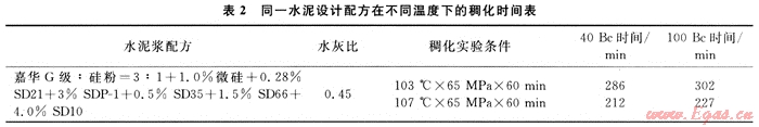 2) 過高估計(jì)循環(huán)溫度會(huì)致使尾管懸掛器喇叭口水泥石長(zhǎng)期無強(qiáng)度。深井Ø177.8mm尾管固井封固段長(zhǎng)度可能超過2000m,水泥石上下溫差達(dá)到50℃左右,這些都與循環(huán)溫度密切相關(guān)。