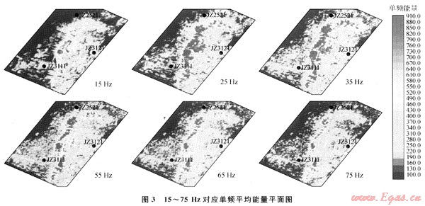 利用基于廣義S變換的頻譜成像儲(chǔ)層預(yù)測技術(shù)對JZ31-6構(gòu)造東二下段北部濁積體開展了研究。利用頻率掃描結(jié)果分析東二下段北部濁積體整體和局部單頻能量強(qiáng)弱的變化,進(jìn)而了解砂體整體和局部特征如厚度、砂體尖滅邊界等。圖3為東二下段北部濁積體從15Hz到75Hz對應(yīng)單頻平均能量的平面圖,顏色越紅表示能量越強(qiáng)。從15Hz到35Hz的分頻平面圖反映出了該濁積體厚層和整體特征;從35Hz到75Hz的分頻平面圖,逐步反映出了砂體薄層和局部特征。35Hz的分頻平面圖比較模糊的地反映出了濁積體由3個(gè)局部砂體組成。在更高頻率的分頻平面圖上,更清楚地反映出北部濁積體是由3個(gè)局部砂體組成的。這一預(yù)測結(jié)果已被后來鉆井所證實(shí)。