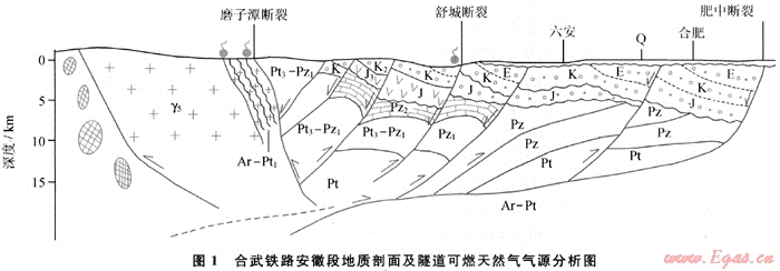 合武鐵路為合肥至武漢的客運專線鐵路,途徑位于大別山的金寨區(qū)段。該區(qū)段河谷深切,相對高差最大達500m,共設計施工了17座隧道。自2005年10月28日~2006年1月9日,紅石巖、五福堂、九斗沖、周家坳、金寨、汀筒溝和喬家山隧道在施工過程中先后發(fā)生了不同程度的氣體燃燒現(xiàn)象,尤其是長達7857m的紅石巖隧道曾發(fā)生過多次燃燒。片麻巖隧道出現(xiàn)可燃氣的現(xiàn)象是極其罕見的,筆者主要通過對大別造山帶合武鐵路金寨區(qū)段區(qū)域性片(麻)巖隧道燃燒現(xiàn)象的系統(tǒng)分析,結(jié)合大別造山帶、合肥盆地的演化特征和海相烴源巖發(fā)育狀況,探討合肥盆地油氣勘探前景及下一步的勘探思路。