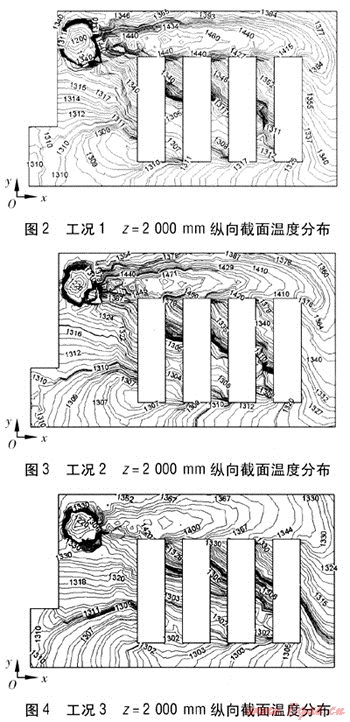根據(jù)上述模型和運(yùn)行參數(shù),燃?xì)夂涂諝馔ㄟ^后墻上的燃燒器噴入。3種工況在均熱爐中的燃燒模擬結(jié)果圖2~4,它們是通過z=2000mm縱向(爐長方向)上的截面。
