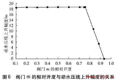 要升高系統(tǒng)動水壓線,必須關(guān)小閥門m或開大閥門n。以圖4為基準,此時閥門n全開,閥門m相對開度為0.931,動水壓線要上升只能關(guān)小閥門m。隨著閥門m關(guān)小,定壓點壓力下降,補水泵向系統(tǒng)補水,系統(tǒng)動水壓上升,直到達到圖3中的動水壓線,此時補水泵強行關(guān)閉。在此過程中,閥門m的相對開度與動水壓線上升幅度關(guān)系見圖6。由圖6可知,以閥門m相對開度0.931時為基準,關(guān)小閥門m,隨著系統(tǒng)補水,動水壓線上升。當閥門m相對開度減小到0.750時,動水壓線上升至圖3的上限,此時補水泵強行關(guān)閉,閥門m繼續(xù)關(guān)小,動水壓線也不會上升。