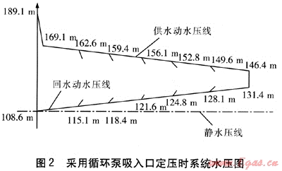 系統(tǒng)水頭損失由熱源、管網(wǎng)、熱力站水頭損失3部分組成。各部分水頭損失為[1~2]:熱源20m;管網(wǎng)水頭損失包括沿程和局部水頭損失,經(jīng)濟比摩阻取50Pa/m,局部水頭損失按沿程水頭損失的30%計算;熱力站的水頭損失為15m。經(jīng)計算,系統(tǒng)水頭損失為80.5m。當采用常規(guī)的循環(huán)泵吸入口定壓時,系統(tǒng)水壓圖見圖2。