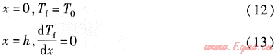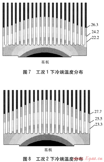 ③ 工況1:輸入電流為4A,保持熱端溫度為40℃,冷熱端溫差為30℃,熱電制冷器的制冷量為25.6W,熱端換熱介質(zhì)溫度為30℃,冷端肋片表面?zhèn)鳠嵯禂?shù)為85W/(m2·K)時(shí),達(dá)到穩(wěn)定時(shí)冷端溫度分布見圖7。圖中數(shù)據(jù)為各等溫層溫度,單位為℃,圖8~10采用同樣方法標(biāo)注。工況2:若熱端換熱介質(zhì)溫度為33℃,要獲得同樣的丁作溫度,則冷端肋片表面?zhèn)鳠嵯禂?shù)為60W/(m2·K),達(dá)到穩(wěn)定時(shí)冷端溫度分布見圖8。