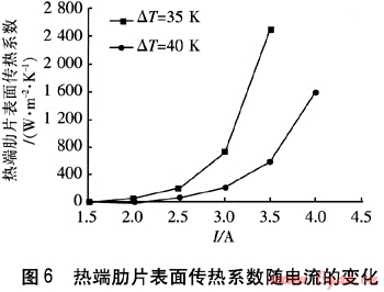 ② 保持冷端溫度10℃和環(huán)境溫度30℃不變,對(duì)應(yīng)不同冷熱端溫差時(shí),熱端肋片表面?zhèn)鳠嵯禂?shù)隨電流的變化見圖6。由圖6可知,肋片表面?zhèn)鳠嵯禂?shù)隨電流的增加而增大,且增加幅度較大。冷端溫度一定時(shí),冷熱端溫差越小,熱端肋片表面?zhèn)鳠嵯禂?shù)越大。
