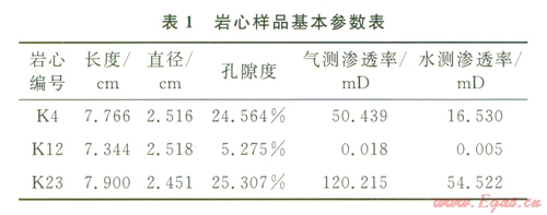 實(shí)驗(yàn)樣品選取某水驅(qū)砂巖氣藏型儲(chǔ)氣庫儲(chǔ)層巖心,代表地下儲(chǔ)氣庫高、中、低各類滲透率級(jí)別的儲(chǔ)層,樣品基礎(chǔ)參數(shù)見表l。