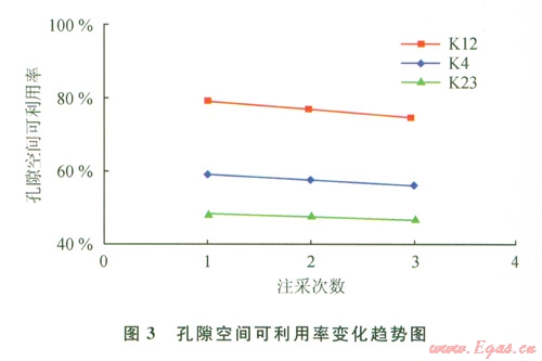 利用各輪氣、水互驅(qū)的束縛水、殘余氣飽和度,計(jì)算各類儲(chǔ)層巖心孔隙空間可利用率,結(jié)果見圖3。經(jīng)3輪氣、水互驅(qū),各類儲(chǔ)層孔隙空間可利用率的差距較為明顯,高、中、低滲率層孔隙空間可利用率分別為46.5%、56.0%、74.0%,并且隨著氣、水互驅(qū)輪次的增加,儲(chǔ)層孔隙空間可利用率表現(xiàn)為下降趨勢。其中低滲透率層孔隙空間可利用率下降幅度較大,表明由于孔喉發(fā)育較差,低滲透率儲(chǔ)層孔隙空間動(dòng)用能力受水驅(qū)效果影響更加明顯。