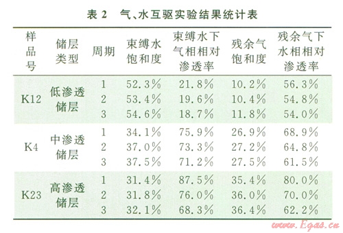 針對(duì)各類儲(chǔ)層巖心的3輪氣、水互驅(qū)結(jié)果(表2),分析水驅(qū)砂巖氣藏型儲(chǔ)層氣、水二相的滲流特征及兩相流動(dòng)區(qū)間的變化規(guī)律。