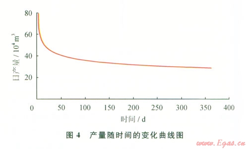 從圖4中可以看出在壓裂水平井中初始產(chǎn)量一般相對(duì)較高且隨時(shí)間遞減較快,在生產(chǎn)4050 d后遞減速率才趨于平穩(wěn)。通過(guò)計(jì)算預(yù)測(cè)年均日產(chǎn)量為34.460 9×104 m3,實(shí)際生產(chǎn)時(shí)的年均日產(chǎn)量為33.564 9×104 m3,實(shí)際產(chǎn)量和預(yù)測(cè)產(chǎn)量的誤差為2.6%。從上面數(shù)據(jù)可以看出實(shí)際產(chǎn)量和模擬產(chǎn)量存在一定差別,這主要是模擬計(jì)算受到提供的裂縫間距、裂縫方位角和表皮系數(shù)等參數(shù)的影響。另外,實(shí)際生產(chǎn)時(shí),還會(huì)存在兩種微弱的壓力降:氣體在水平井筒內(nèi)流動(dòng)的摩阻壓降[9]及從裂縫進(jìn)入水平井筒時(shí)產(chǎn)生的加速度壓降,它們對(duì)于模擬計(jì)算結(jié)果也會(huì)產(chǎn)生一定的影響。