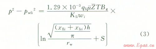 根據(jù)面積相等可得(xfli+ xfri)h=nRi2(式中xflixfri分別為第i條裂縫的左右翼的長(zhǎng)度,Ri為氣藏的當(dāng)量半徑),所以第i條裂縫的流動(dòng)可以看成是流動(dòng)半徑為Ri,其中,地層厚度為ωi,邊界壓力的平方為裂縫尖端壓力平方p2(xfiyfi,t),井底流壓為水平井井筒內(nèi)壓力pwfi的微型氣藏[7],其流動(dòng)方式可以看成是氣藏的平面徑向流。根據(jù)氣井產(chǎn)能計(jì)算公式,可以把氣體由裂縫向井筒的滲流過(guò)程表示為: