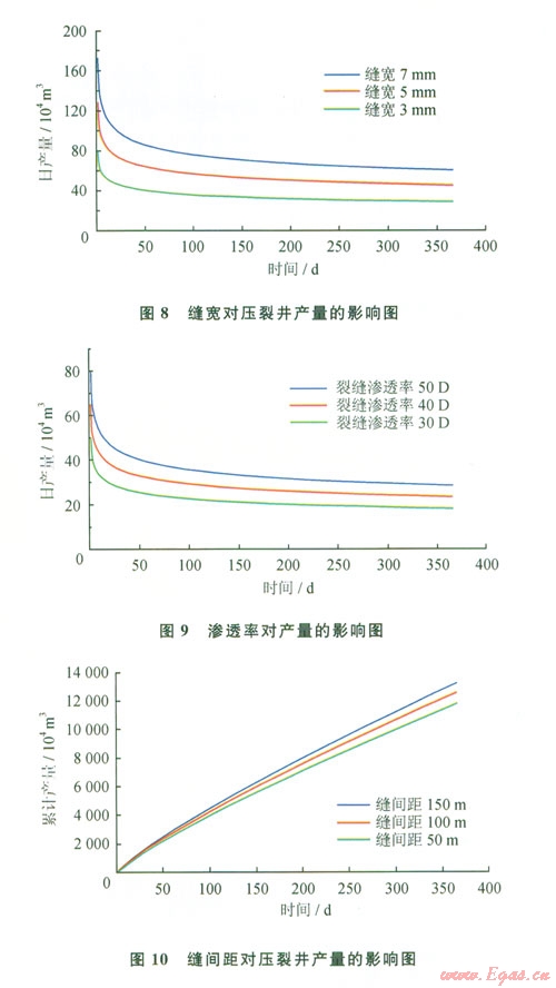 綜合圖810可以得知:壓裂水平氣井的產(chǎn)量是隨著裂縫寬度和裂縫滲透率的增加而增加,并且增長(zhǎng)效果顯著。但是隨著滲透率和寬度的逐漸加大,產(chǎn)量增加的幅度在減??;裂縫間距的增加也會(huì)引起產(chǎn)量的增加。因此,在壓裂方案設(shè)計(jì)和實(shí)際施工時(shí)應(yīng)把握好主要因素,使各參數(shù)的數(shù)值控制在合理的范圍內(nèi),最大限度地提高氣井產(chǎn)量。