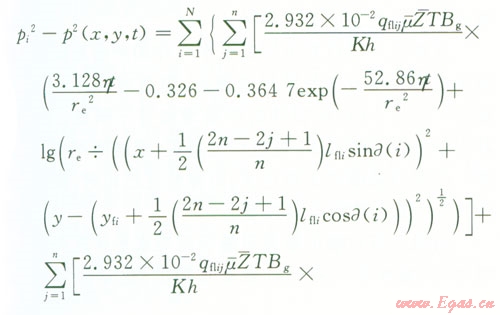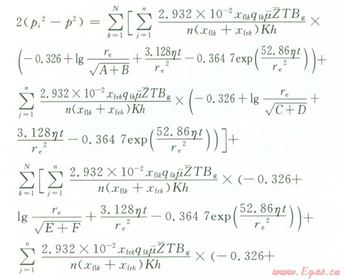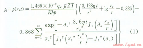 pi為原始地層壓力,MPa;p(x,y,t)為平面上的點(diǎn)(x,y)t時(shí)刻地層的壓力,MPap(-)為氣藏平均壓力,MPaqsc為標(biāo)準(zhǔn)狀況下點(diǎn)匯處氣體的體積流量,l04 m3d;μ(-)為平均壓力和溫度下的氣體的黏度,mPa·s;Bg為地下氣體的體積系數(shù),無(wú)量綱;K為氣層滲透率,D;h為產(chǎn)層厚度,m;x0、y0分別為點(diǎn)匯的坐標(biāo),mT為氣層溫度,Kre為封閉外邊界半徑,m;t為滲流時(shí)間,h;Z(-)為平均溫度和壓力下的天然氣偏差因子,利用D-A-K方法求;η為地層導(dǎo)壓系數(shù),μm2·MPa(mPa·s),η=K/(μCφ);an為方程X的根;J1、Y1為第一類(lèi)、第二類(lèi)一階貝塞爾函數(shù)。
