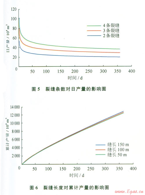 在前面相同的油藏參數(shù)基礎(chǔ)上,分別改變裂縫長(zhǎng)度、裂縫寬度、裂縫滲透率、裂縫問(wèn)距和方位角等輸人參數(shù),利用本模型可以模擬各個(gè)裂縫參數(shù)的變化對(duì)壓裂水平氣井產(chǎn)量的影響情況。