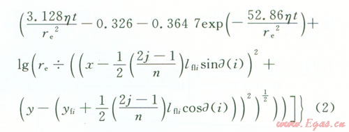 設(shè)第i條裂縫起裂點(diǎn)的坐標(biāo)為(0,yfi),左翼裂縫長(zhǎng)度為xfli,右翼裂縫長(zhǎng)度為xfri,則據(jù)此可求出第i條裂縫左翼和右翼上第j個(gè)點(diǎn)匯的坐標(biāo)(取該小段中點(diǎn)坐標(biāo))。然后把各條裂縫上各個(gè)點(diǎn)匯的坐標(biāo)代入式(1),在考慮體積系數(shù)的情況下把它化為直角坐標(biāo)系,并利用貝塞爾函數(shù)的性質(zhì)可得第i條裂縫t時(shí)刻在地層中任意一點(diǎn)(x,y)處產(chǎn)生的壓降,最后根據(jù)勢(shì)的疊加原理就可求出n條裂縫t時(shí)刻在地層任意一點(diǎn)(xy)處產(chǎn)生的壓降,即
