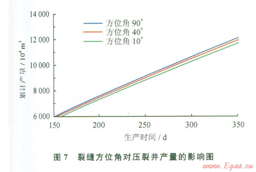 由圖7可以看出隨著裂縫平面與水平井筒夾角的增大,壓裂水平氣井的產(chǎn)量是增加的。這是因?yàn)楦鳁l裂縫之間的垂直距離變大,使得各條裂縫之間的相互干擾減弱,這就增大了每一條裂縫的有效泄流面積,增加了每條裂縫的產(chǎn)量,促使了壓裂氣井產(chǎn)量的增加。