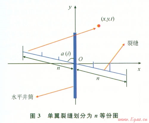在時(shí)間間隔很小的時(shí)候,式(1)可以用于實(shí)際產(chǎn)量的計(jì)算。由于水平井筒不一定沿最小主應(yīng)力方向,所以水平井筒可能和裂縫成任意夾角,以水平井筒的井軸的方向?yàn)?span lang="EN-US">y軸方向,假設(shè)第i條裂縫與水平井筒的夾角為a (i)(0°≤a≤90°),如圖3將兩翼裂縫都分成n等份[6],每一份可看成一個(gè)點(diǎn)匯。此時(shí),就把每一個(gè)點(diǎn)匯的坐標(biāo)與裂縫的長(zhǎng)度和裂縫方位角a(i)聯(lián)系了起來(lái)。