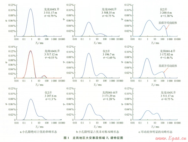 根據(jù)對中國石油西南油氣田公司川中油氣礦測試的秋林1井大安寨段石灰?guī)r壓汞資料的分析,石灰?guī)r基本不具備儲集空間;中國石油西南油氣田公司勘探開發(fā)研究院所作的龍崗地區(qū)大安寨段灰?guī)r的核磁T2譜特征分析結(jié)果,同樣表明其孔隙度極小,而儀2井大安寨段石灰?guī)r孔隙度高,含基質(zhì)可動流體,但卻沒有工業(yè)氣流產(chǎn)出(圖1)。