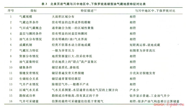 根據(jù)陳更生等[3]總結(jié)的北美頁巖氣藏l6種地質(zhì)特征與川中地區(qū)中、下侏羅統(tǒng)進行對比的結(jié)果如表3所示。表3表明川中地區(qū)中、下侏羅統(tǒng)油氣藏,絕大多數(shù)條件具有與頁巖油氣藏類似的特征。如第9項:油氣富集特征,目前所獲常規(guī)油氣井,正是在“甜點”油氣富集區(qū)處,應用常規(guī)(目前逐漸使用一些非常規(guī)的增產(chǎn)措施,如水平井,而酸化壓裂則早已引人使用)鉆井即能獲得工業(yè)油氣流,可以期待,隨著頁巖油氣藏開采技術(shù)的引進應用,必將獲得更大的油氣產(chǎn)量;而成藏機制和資源量則需要重新進行研究和評價。