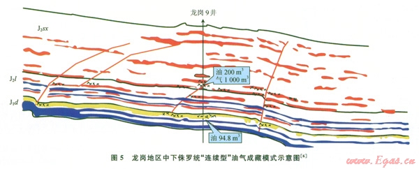 在構(gòu)造較平緩的斜坡帶地區(qū)如龍崗9井或龍崗7井等廣大的區(qū)域,中、下侏羅統(tǒng)的主要烴源巖為涼上段的黑色泥頁巖以及大安寨段的黑色泥頁巖、石灰?guī)r,這些烴源巖生成的烴類,首先由附近的小斷裂或(和)裂縫(構(gòu)造縫、層間縫)的疏導,向就近的涼高山組或大安寨段中的具有一定儲集條件的砂巖中或富有溶蝕孔隙、裂縫的介殼灰?guī)r中運移、聚集。從而形成一些自生自儲型的孤立的巖性或裂縫性油氣藏。