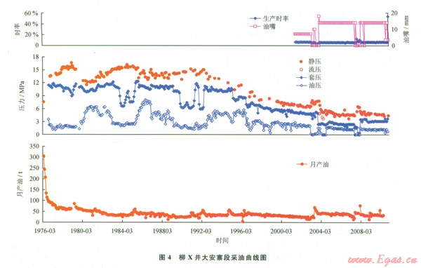 裂縫型油氣藏的生產(chǎn)特點是初始產(chǎn)量高、壓力下降快、能量衰減快、生產(chǎn)時間短。從柳X井的采油曲線來觀察,和許多川中地區(qū)其他構(gòu)造侏羅系的采油生產(chǎn)曲線特征相似——初始表現(xiàn)出裂縫型油氣藏的特點:初始產(chǎn)量高、持續(xù)時間短、壓力下降快、連續(xù)生產(chǎn)時間短(該井在2001年之前沒有生產(chǎn)時率的紀錄,在有記錄的2001年1月-2010年4月整個生產(chǎn)過程中,生產(chǎn)時率介于2%~l2%,平均時率為6.1%。有些更低者可在2%左右,普遍小于20%);但是后期隨著時間的推移(2004年以后生產(chǎn)時率在3%以下),這時生產(chǎn)壓力會在較低壓力處恢復穩(wěn)定(圖4),總的生產(chǎn)時間長(有些井間歇性產(chǎn)油可達數(shù)十年,如柳X井:1976-2010年,柳X井大安寨段油氣藏最終累計產(chǎn)原油達數(shù)萬噸)。